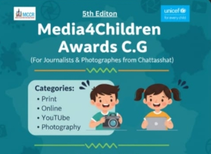 रायपुर : छत्तीसगढ़ में कार्यरत पत्रकारों के लिए, वर्ष 2025-26 के, पांचवें संस्करण के, Media for Children Awards 2025 की घोषणा। (मीडिया फॉर चिल्ड्रेन अवॉर्ड, सफल पांचवां वर्ष)